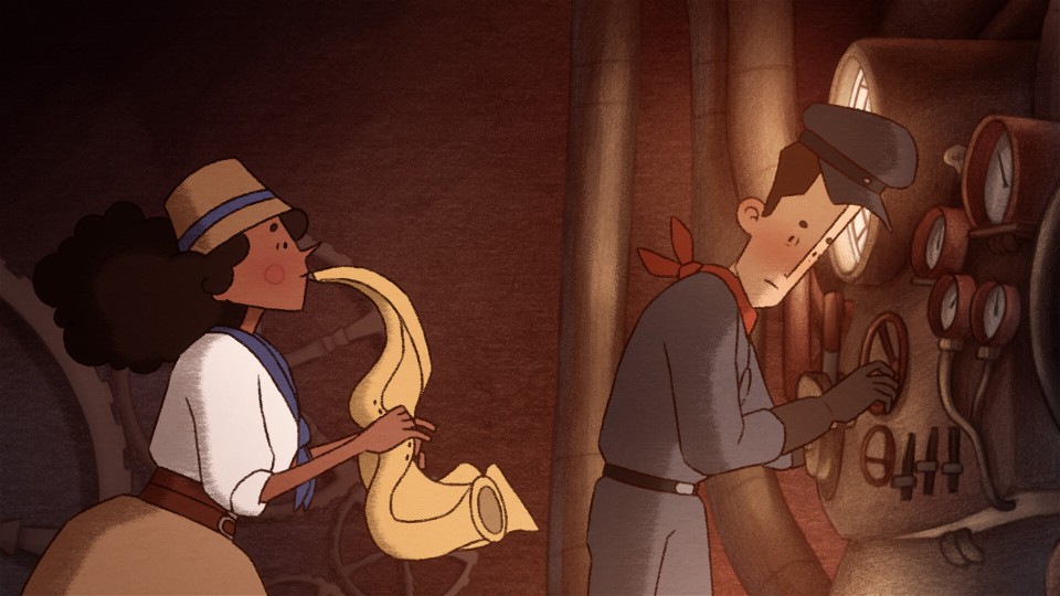 Peregrin, the train conductor, does his work dutifully on line 12. He drives the train over deep abysses and oceans to connect cities that loom like towering mountains. The train is already departing when the free-spirited musician Clara sneaks on the train at the last minute, forcing Peregrin to make an emergency stop. When he goes to investigate what caused the disturbance, he meets Clara. It is apparent that the two know each other and that he is annoyed by her presence and her quirky manner. She follows him into the engine room and starts playing on her saxophone. Peregrin is mesmerized and distracted by her enchanting music so that the lever for the brakes breaks, and the whole system is out of tune. To save the train and its passengers from crashing, Peregrin needs to climb on top of the train, and Clara needs to push buttons and turn wheels in tune. After a nerve-racking struggle, they manage to work together and stop the train. Relieved and exausted Pergrin sits atop the train and finally gets a chance to admire the beautiful nightly scenery. Clara joins him, and together they marvel for a moment at the midnight sky and the planets above, the ocean underneath and the distant city ahead. Back in the driver's cabin, the engine is missing too many pipes. Without them the train can't continue its journey. Clara offers her saxophones three pipes, and with them, the two of them repair the engine and continue their journey.